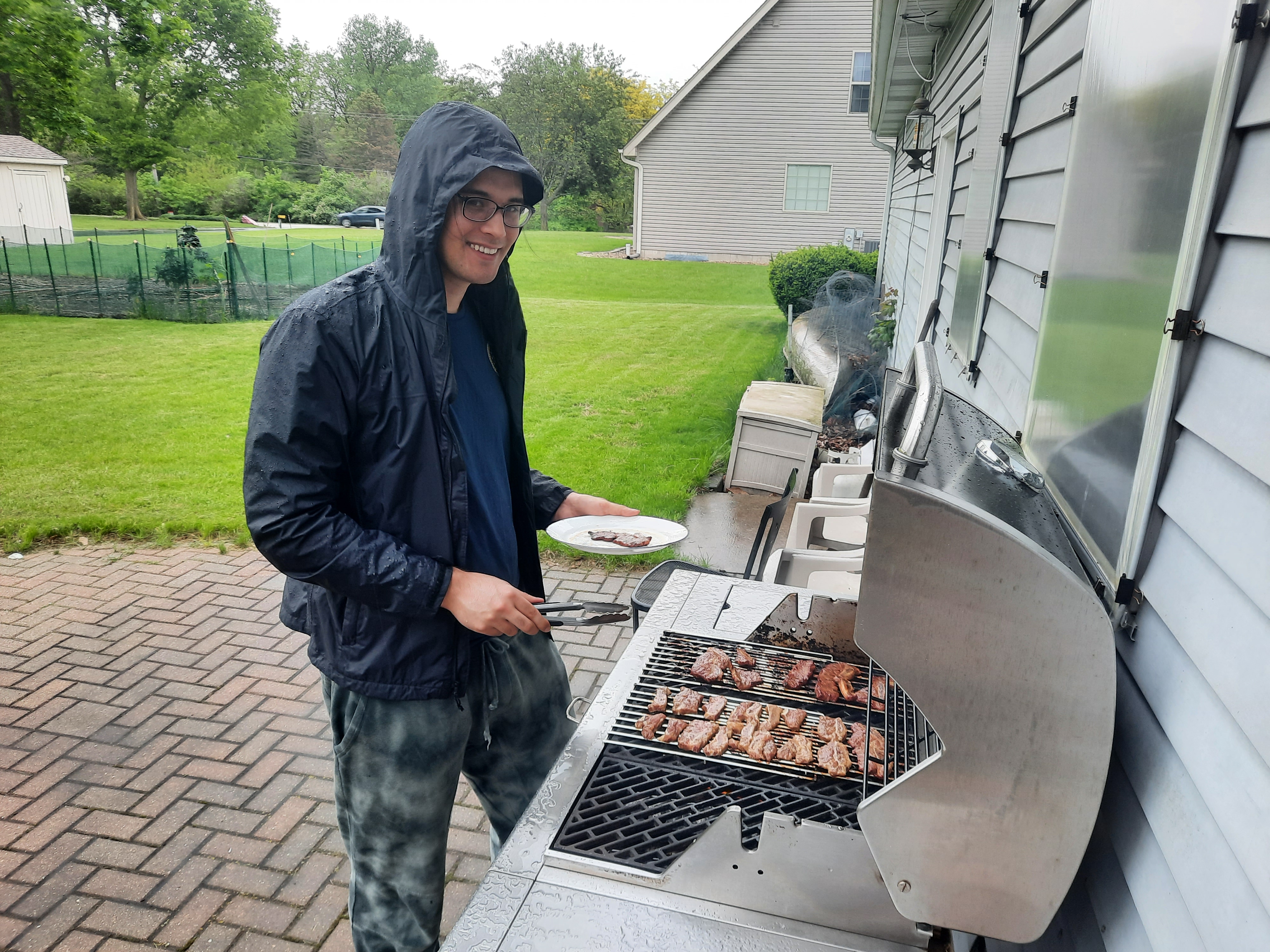 앤드류가 그릴에 갈비를 구워서 점심을 함께 먹고,