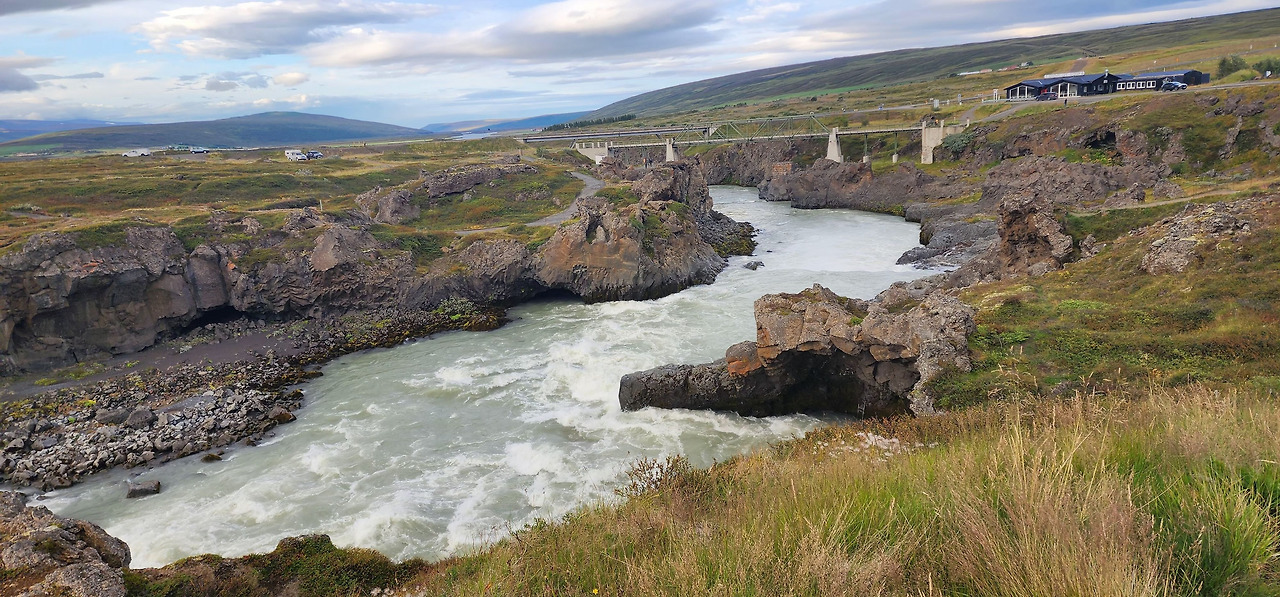Godafoss 폭포수가 흘러가는 계곡
