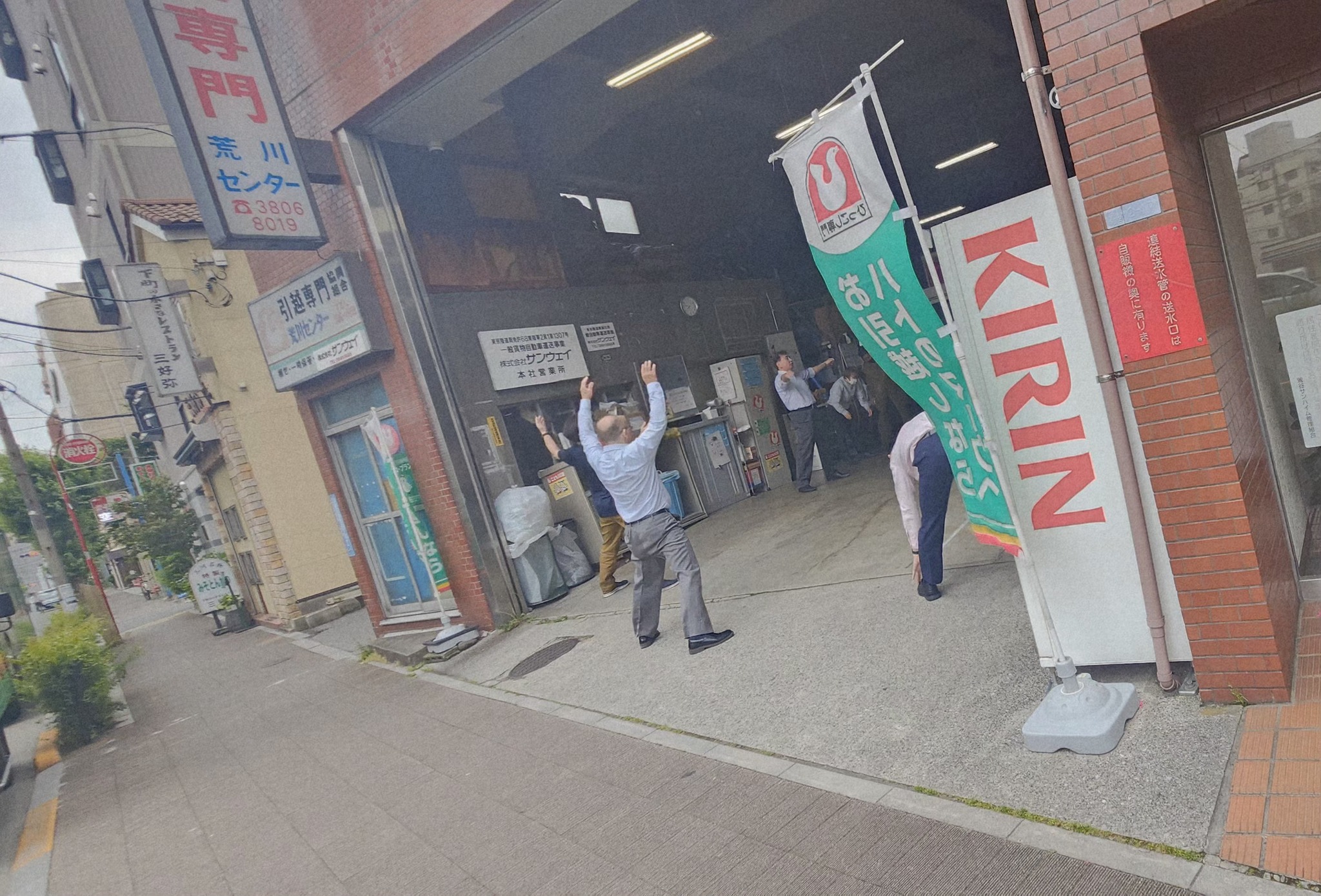 근무시작하기 전에 직원들이 체조를 하고 있었다