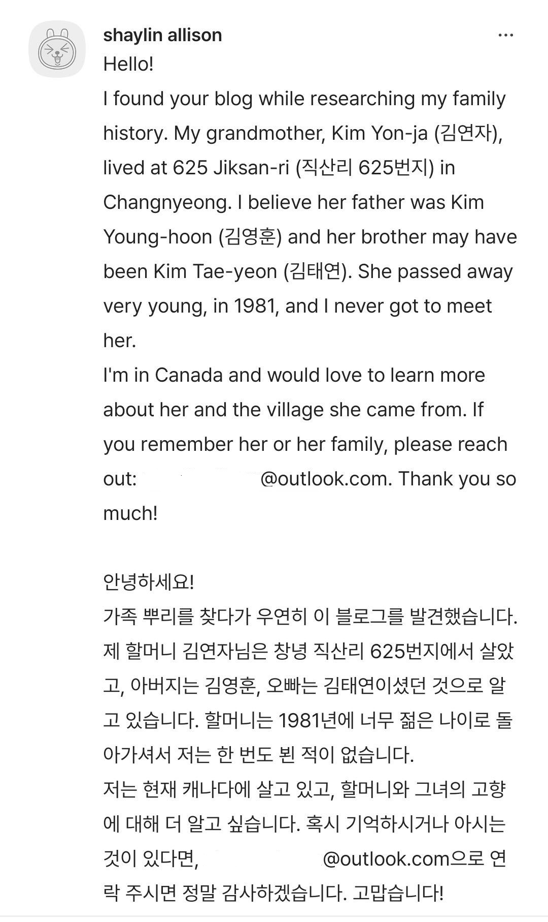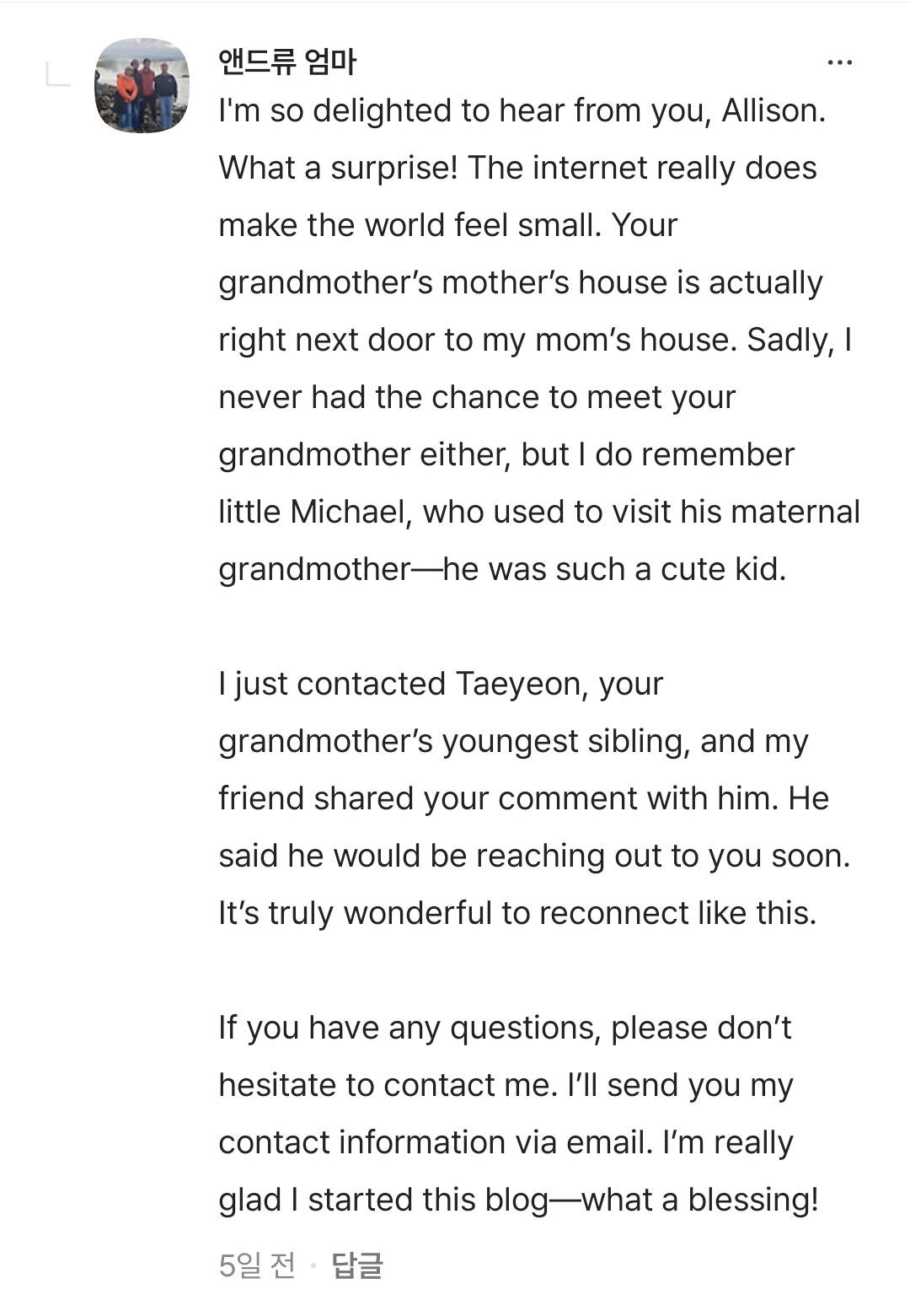 할머니의 한국 가족들과 할머니 고향에 대해