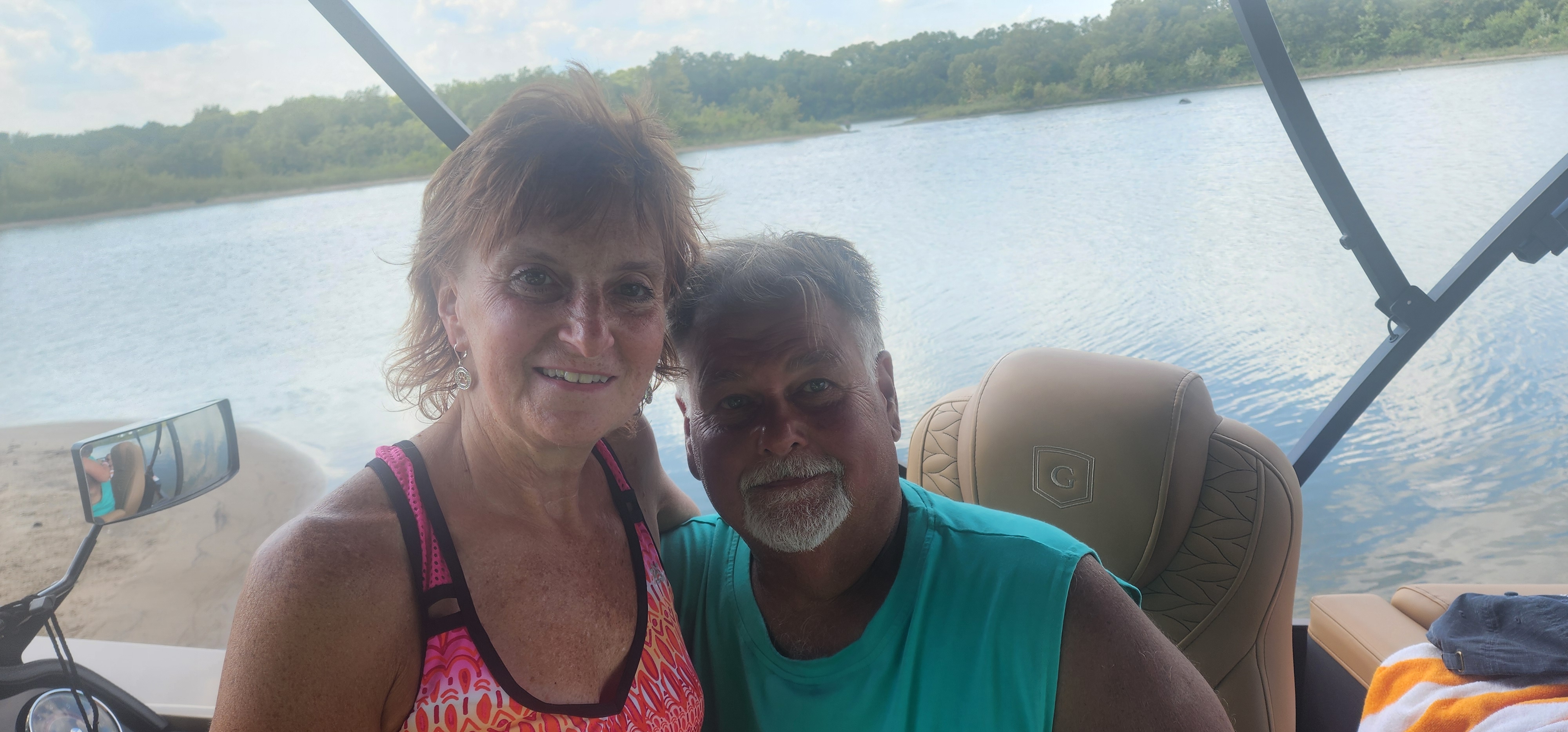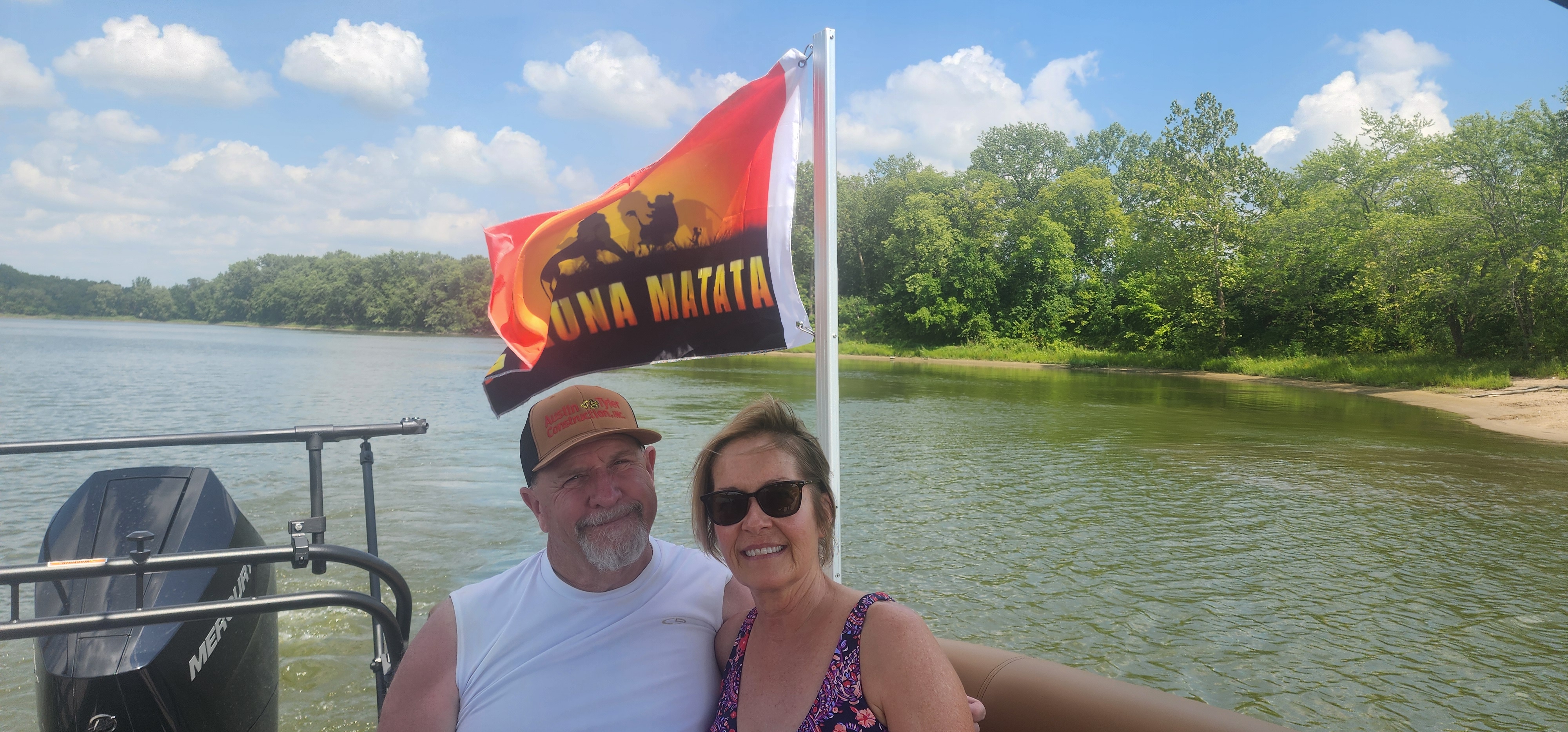 대형 판툰(보트)이 있는 이웃 친구 릭과 트레이쉬가